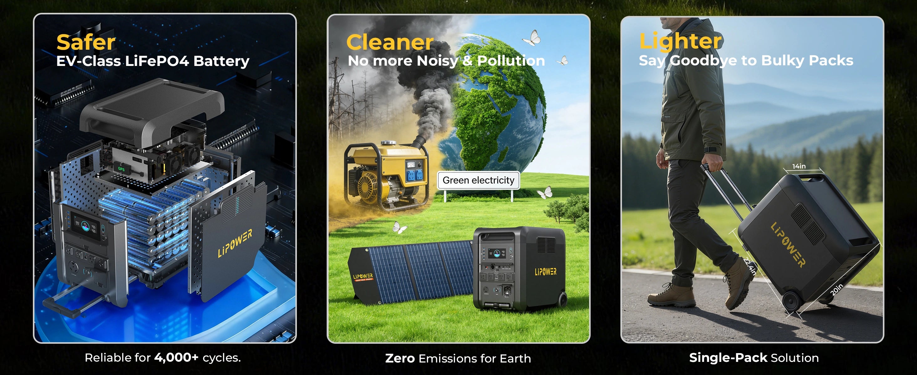 Resistente a la intemperie y a temperaturas extremas con clasificación IP67: Diseñado para entornos exteriores hostiles, funciona de forma fiable en temperaturas extremas de -20 °C a 60 °C (-4 °F a 140 °F). Ofrece energía silenciosa en cualquier clima, con un nivel de ruido de <50 dB, para vehículos recreativos, obras y mercados al aire libre.