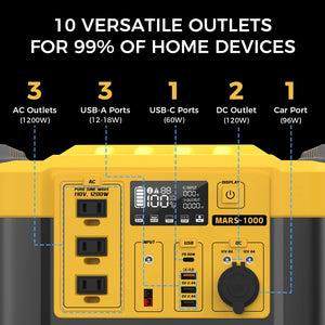10 Multifunctional Outputs: Power station 1000W features 3 x 110V PURE SINE WAVE AC outlets, 3 x USB A port, 1 x USB-C (PD 60W ), 2 x 12V DC port , 1 x 12V Car Charging Port.