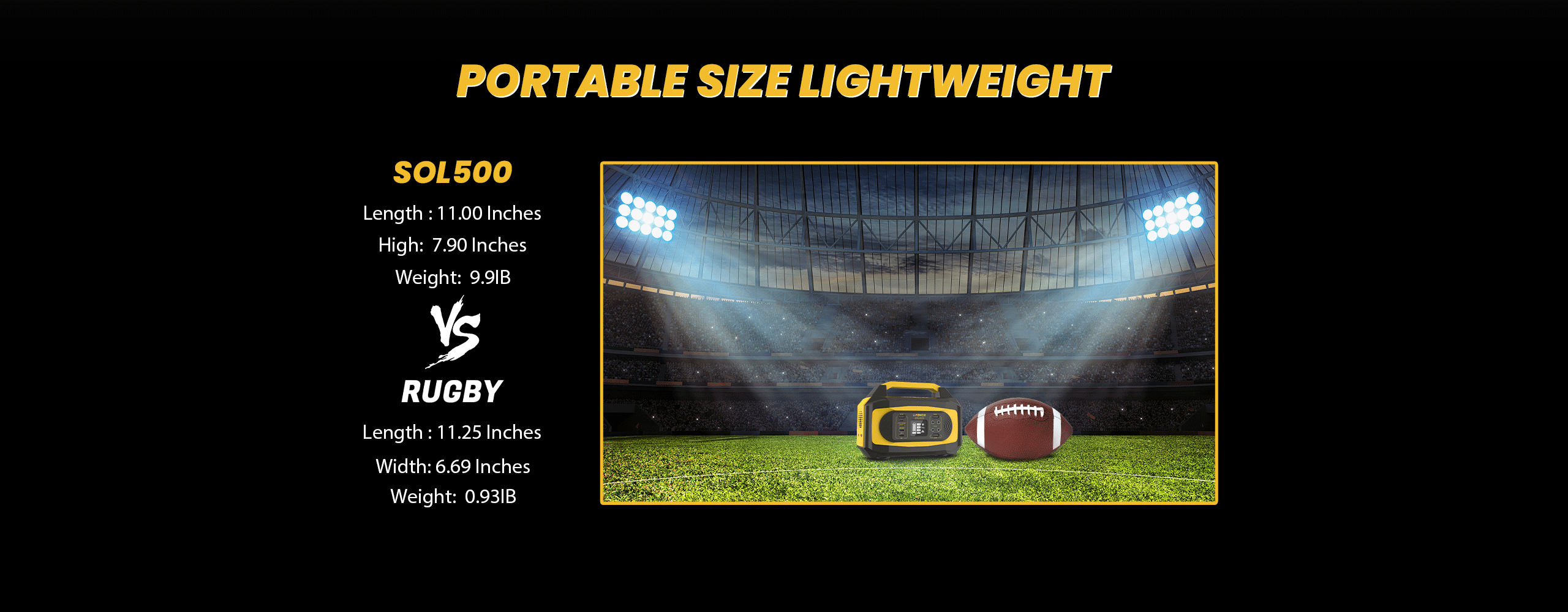 - Designed for Portability -- The mobile power station SOL500 is only 11.0x7.9x4.5 inches (American football length is 11.2 inches) and weight is 9.9 lbs, which is lightweight, compact and comes with a handy handle. It is your best choice for camping in your RV, dealing with road trip emergencies and home power outages (CPAP users).