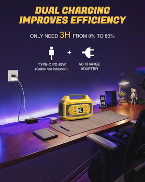 3 Ways to Recharge: LIPOWER 500W portable camping battery can be fully charged from 1) sun by using solar panels (NOT INCLUDED)(Note: DC 5.5mm x 2.1mm); 2) car chargers; 3) directly plugged into a wall socket.